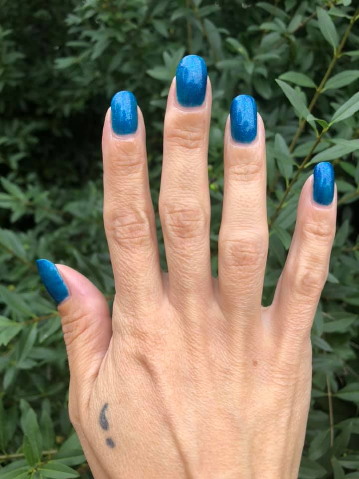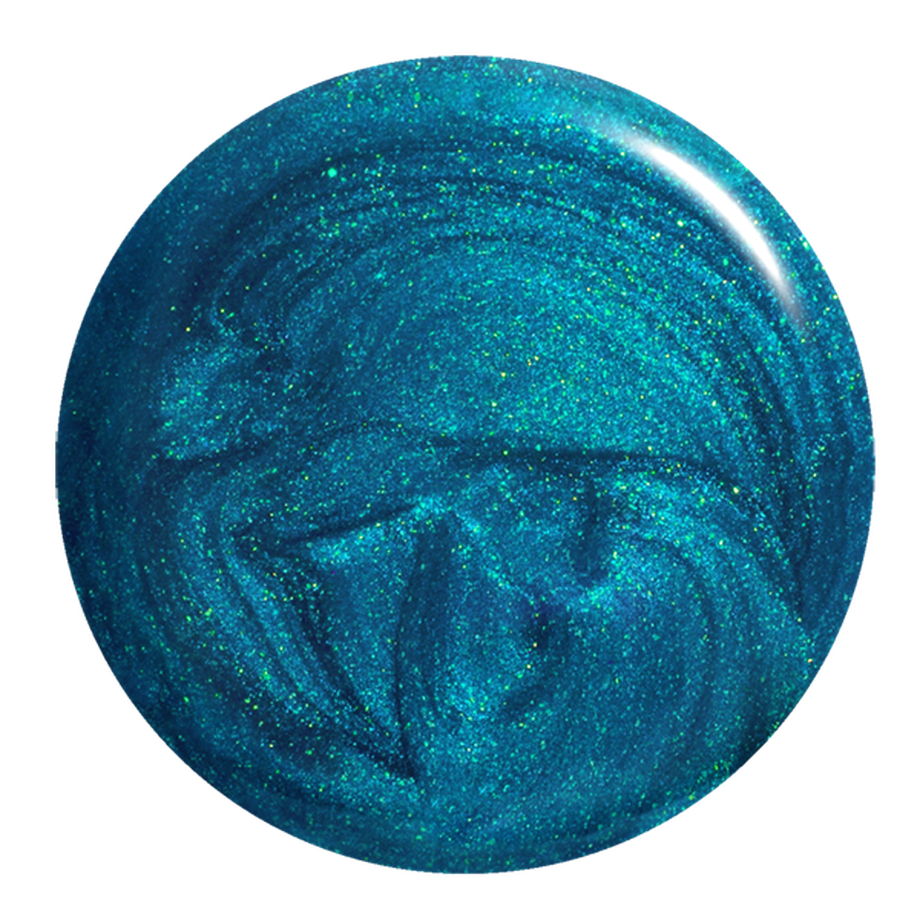 Cerulean blue with green tint. Dark. Frosted. Opaque. Cool undertone.